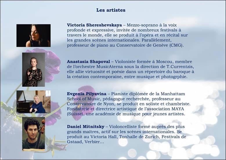 Programme musical chanté par Victoria Shereshevskaya (mezzo-soprano) et accompagnée par Evgenia Pilyavina (piano) Anastasia Shapoval (violon), Daniel Mitnitsky (violoncelle) qui interpréteront les œuvres de Tchaïkovski, Rachmaninov, Glinka, Fauré, Massenet, Bizet…
