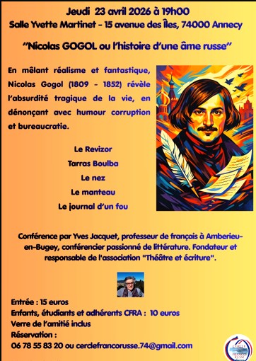 Conférence "Nicolas Gogol ou l'histoire d'une âme russe" par Yves Jaquet, ancien professeur de français au lycée professionnel Alexandre Bérard à Ambérieu-en-Bugey.