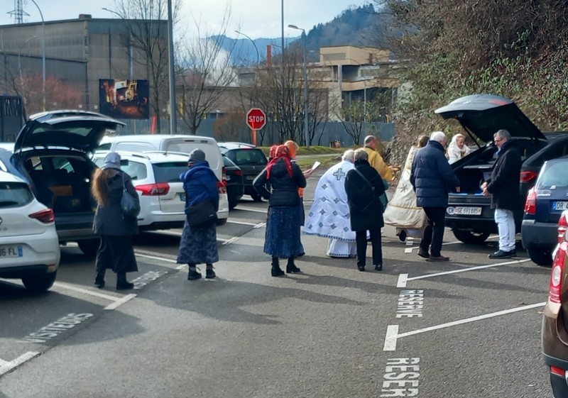 Á LA DEMANDE DES FIDÈLES L'ASSEMBLÉE S'EST RENDUE SUR LE PARKING POUR UNE BÉNÉDICTION DES VOITURES DES FIDÈLES.